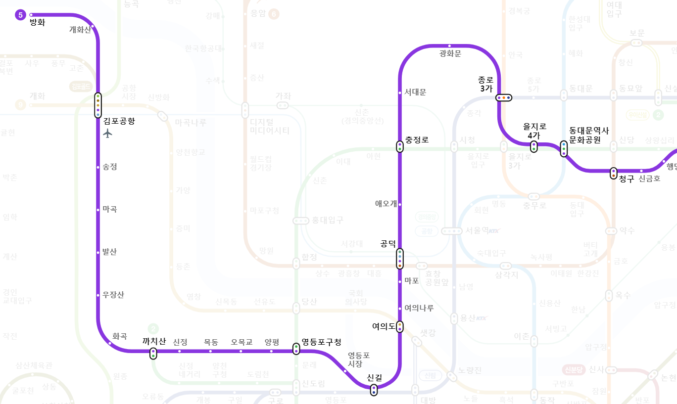 5호선은 서울 지하철의 여러 노선과 환승이 가능하여 승객들이 다양한 경로로 이동할 수 있게 합니다. 주요 환승역으로는 여의도역(9호선), 왕십리역(2호선, 경의중앙선, 분당선), 천호역(8호선), 고덕역(고덕선) 등이 있습니다. 이러한 환승역들은 서울 내 다양한 지역으로의 접근성을 높여줍니다.