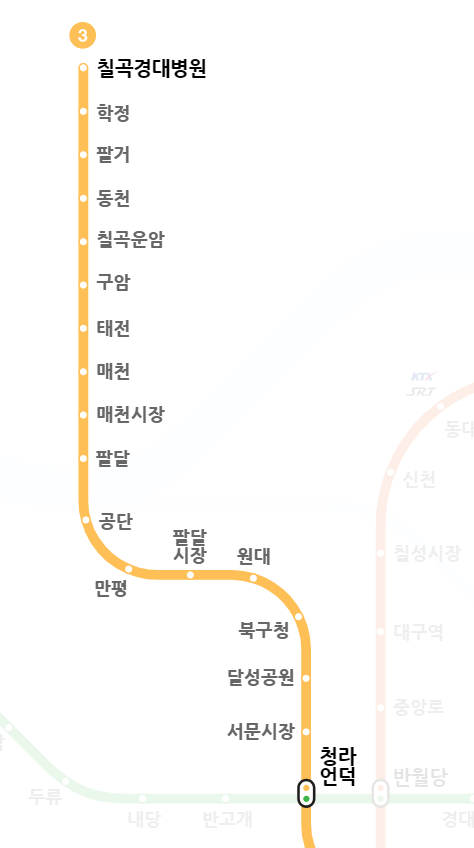 칠곡경대병원역: 칠곡경대병원역은 대구의 북쪽 끝에 위치한 역으로, 칠곡경북대학교병원과 인접해 있습니다. 많은 환자와 의료진들이 이용하는 중요한 역이며, 이 지역의 의료 서비스 접근성을 높입니다.